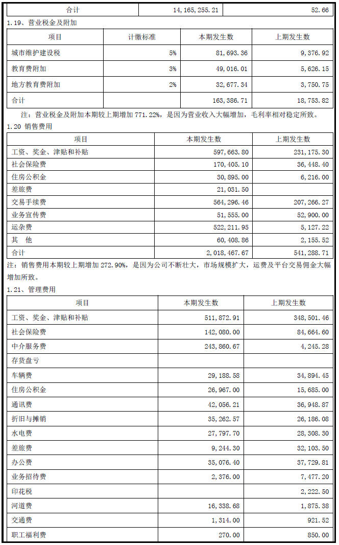 报告期内,营业收入26,901,089.73 元,较去年同期增长278.95%,主要原因是公司规模有所扩大,并拓展了新的业务,业绩大幅提升。营业成本20,624,452.40 元,较去年同期增长257.70%,主要原因是公司业绩提升,相应的营业成本增长。净利润2,203,270.17,较去年同期增长2244.71% ,主要原因是公司规模有所扩大,并拓展了新业务。截止2015 年6 月30 日,总资产24,855,754.05 元。