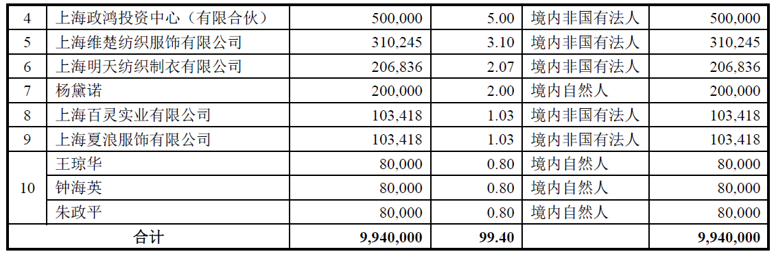 5、公司控制权变动情况 本次发行前,公司实际控制人朱政平,朱政平直接持有公司 80,000 股股份,即 0.80%股本总额,同时持有公司控股股东上海盛顺服装有限公司 61%的出资 额,并担任公司股东上海政鸿投资中心(有限合伙)的执行事务合伙人,并作为 普通合伙人以货币方式认缴上海政鸿投资中心(有限合伙)52,000.00 元即 52% 的出资额,为公司实际控制人。